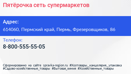 Пятёрочка, сеть супермаркетов по адресу 614060, Пермский край, Пермь, Фрезеровщиков, 86 в дальнейшем Организация, размещена в следующих категориях: