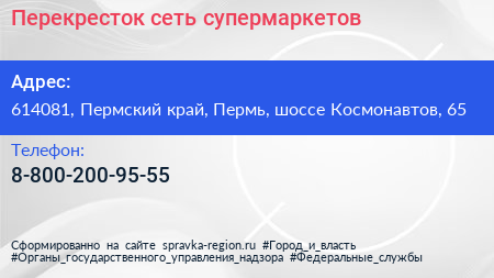 Перекресток, сеть супермаркетов по адресу 614081, Пермский край, Пермь, шоссе Космонавтов, 65 в дальнейшем Организация, размещена в следующих категориях: