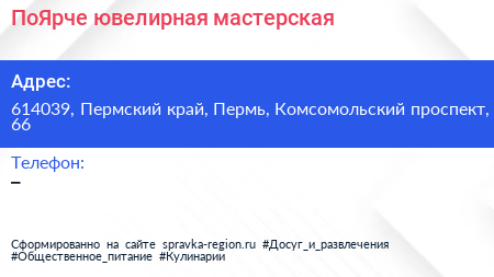 ПоЯрче, ювелирная мастерская по адресу 614039, Пермский край, Пермь, Комсомольский проспект, 66 в дальнейшем Организация, размещена в следующих категориях: