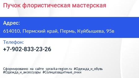 Пучок, флористическая мастерская по адресу 614010, Пермский край, Пермь, Куйбышева, 95в в дальнейшем Организация, размещена в следующих категориях: