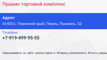 Пушкин, торговый комплекс по адресу 614015, Пермский край, Пермь, Пушкина, 32 в дальнейшем Организация, размещена в следующих категориях: