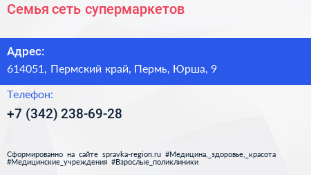 Семья, сеть супермаркетов по адресу 614051, Пермский край, Пермь, Юрша, 9 в дальнейшем Организация, размещена в следующих категориях: