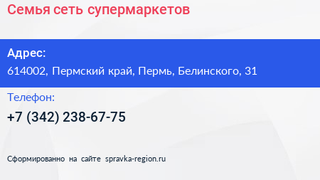 Семья, сеть супермаркетов по адресу 614002, Пермский край, Пермь, Белинского, 31 в дальнейшем Организация, размещена в следующих категориях: