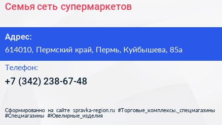 Семья, сеть супермаркетов по адресу 614010, Пермский край, Пермь, Куйбышева, 85а в дальнейшем Организация, размещена в следующих категориях:
