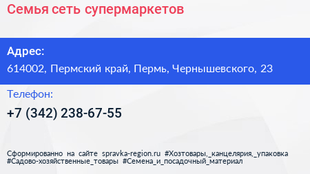 Семья, сеть супермаркетов по адресу 614002, Пермский край, Пермь, Чернышевского, 23 в дальнейшем Организация, размещена в следующих категориях: