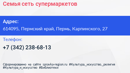 Семья, сеть супермаркетов по адресу 614095, Пермский край, Пермь, Карпинского, 27 в дальнейшем Организация, размещена в следующих категориях: