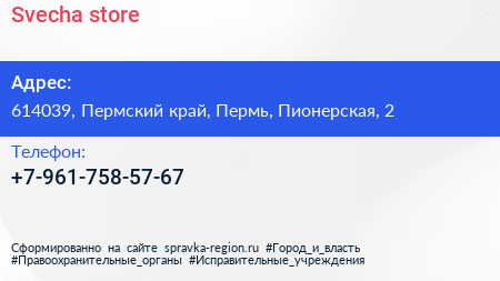 Svecha.store по адресу 614039, Пермский край, Пермь, Пионерская, 2 в дальнейшем Организация, размещена в следующих категориях: