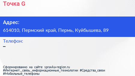 Точка G по адресу 614010, Пермский край, Пермь, Куйбышева, 89 в дальнейшем Организация, размещена в следующих категориях: