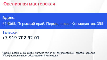Ювелирная мастерская по адресу 614065, Пермский край, Пермь, шоссе Космонавтов, 355 в дальнейшем Организация, размещена в следующих категориях: