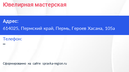 Ювелирная мастерская по адресу 614025, Пермский край, Пермь, Героев Хасана, 105а в дальнейшем Организация, размещена в следующих категориях: