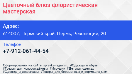 Цветочный блюз, флористическая мастерская по адресу 614007, Пермский край, Пермь, Революции, 20 в дальнейшем Организация, размещена в следующих категориях: