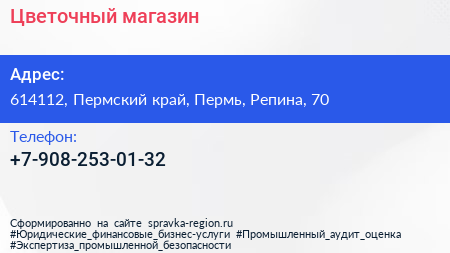 Цветочный магазин по адресу 614112, Пермский край, Пермь, Репина, 70 в дальнейшем Организация, размещена в следующих категориях: