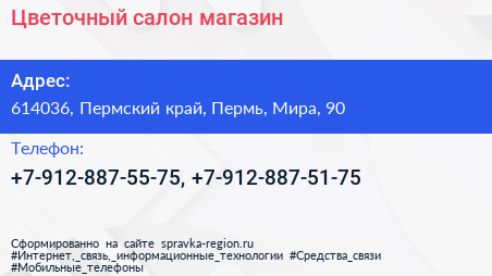 Цветочный салон-магазин по адресу 614036, Пермский край, Пермь, Мира, 90 в дальнейшем Организация, размещена в следующих категориях:
