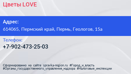 Цветы LOVE по адресу 614065, Пермский край, Пермь, Геологов, 15а в дальнейшем Организация, размещена в следующих категориях: