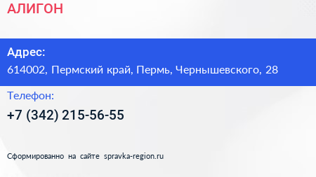 АЛИГОН по адресу 614002, Пермский край, Пермь, Чернышевского, 28 в дальнейшем Организация, размещена в следующих категориях: