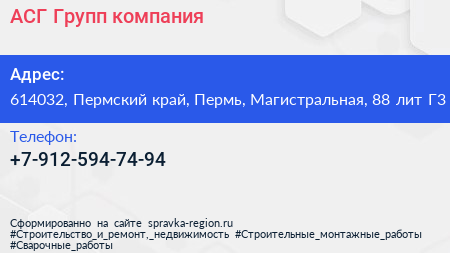 АСГ-Групп, компания по адресу 614032, Пермский край, Пермь, Магистральная, 88 лит Г3 в дальнейшем Организация, размещена в следующих категориях: