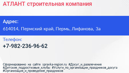 АТЛАНТ, строительная компания по адресу 614014, Пермский край, Пермь, Лифанова, 3а в дальнейшем Организация, размещена в следующих категориях: