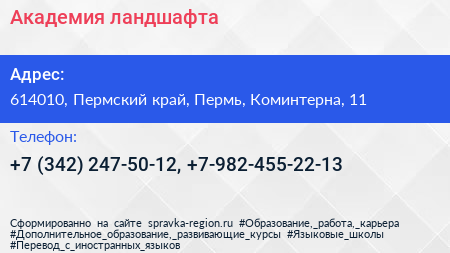 Академия ландшафта по адресу 614010, Пермский край, Пермь, Коминтерна, 11 в дальнейшем Организация, размещена в следующих категориях: