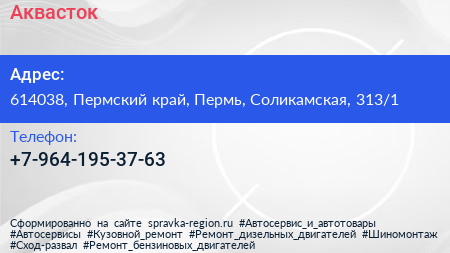 Аквасток по адресу 614038, Пермский край, Пермь, Соликамская, 313/1 в дальнейшем Организация, размещена в следующих категориях: