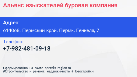 Альянс изыскателей, буровая компания по адресу 614068, Пермский край, Пермь, Генкеля, 7 в дальнейшем Организация, размещена в следующих категориях: