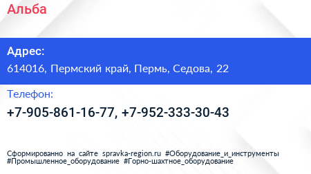 Альба по адресу 614016, Пермский край, Пермь, Седова, 22 в дальнейшем Организация, размещена в следующих категориях: