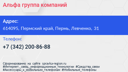 Альфа, группа компаний по адресу 614095, Пермский край, Пермь, Левченко, 31 в дальнейшем Организация, размещена в следующих категориях: