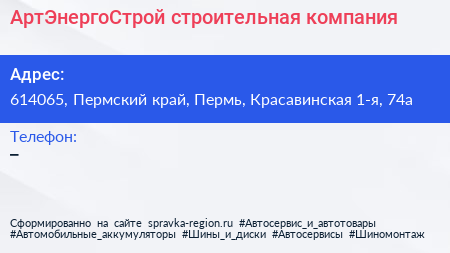 АртЭнергоСтрой, строительная компания по адресу 614065, Пермский край, Пермь, Красавинская 1-я, 74а в дальнейшем Организация, размещена в следующих категориях: