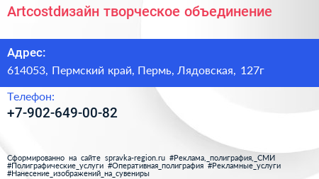 Artcostdизайн, творческое объединение по адресу 614053, Пермский край, Пермь, Лядовская, 127г в дальнейшем Организация, размещена в следующих категориях: