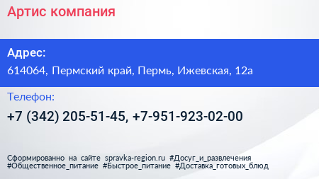Артис, компания по адресу 614064, Пермский край, Пермь, Ижевская, 12а в дальнейшем Организация, размещена в следующих категориях: