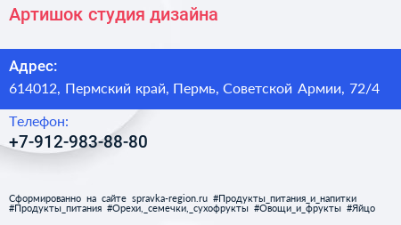 Артишок, студия дизайна по адресу 614012, Пермский край, Пермь, Советской Армии, 72/4 в дальнейшем Организация, размещена в следующих категориях: