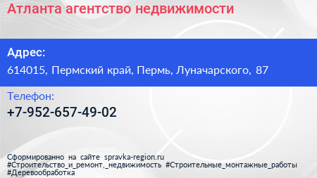 Атланта, агентство недвижимости по адресу 614015, Пермский край, Пермь, Луначарского, 87 в дальнейшем Организация, размещена в следующих категориях: