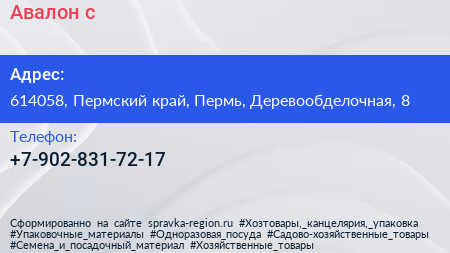 Авалон-с по адресу 614058, Пермский край, Пермь, Деревообделочная, 8 в дальнейшем Организация, размещена в следующих категориях: