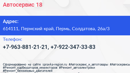 Автосервис-18 по адресу 614111, Пермский край, Пермь, Солдатова, 26а/3 в дальнейшем Организация, размещена в следующих категориях: