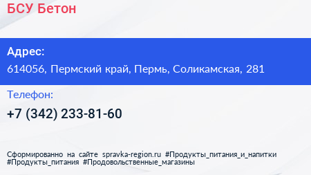 БСУ-Бетон по адресу 614056, Пермский край, Пермь, Соликамская, 281 в дальнейшем Организация, размещена в следующих категориях: