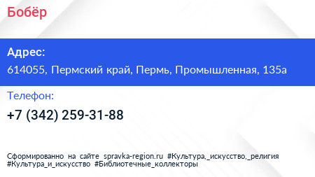 Бобёр по адресу 614055, Пермский край, Пермь, Промышленная, 135а в дальнейшем Организация, размещена в следующих категориях:
