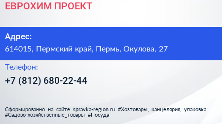 ЕВРОХИМ-ПРОЕКТ по адресу 614015, Пермский край, Пермь, Окулова, 27 в дальнейшем Организация, размещена в следующих категориях: