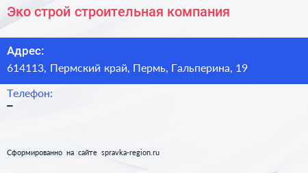 Эко строй, строительная компания по адресу 614113, Пермский край, Пермь, Гальперина, 19 в дальнейшем Организация, размещена в следующих категориях: