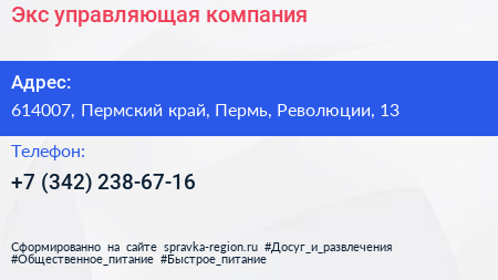 Экс, управляющая компания по адресу 614007, Пермский край, Пермь, Революции, 13 в дальнейшем Организация, размещена в следующих категориях: