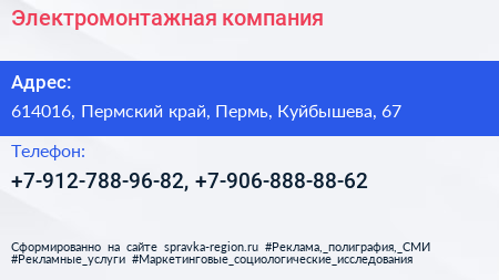 Электромонтажная компания по адресу 614016, Пермский край, Пермь, Куйбышева, 67 в дальнейшем Организация, размещена в следующих категориях: