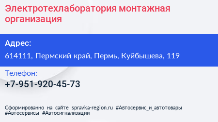 Электротехлаборатория, монтажная организация по адресу 614111, Пермский край, Пермь, Куйбышева, 119 в дальнейшем Организация, размещена в следующих категориях: