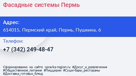 Фасадные системы-Пермь по адресу 614015, Пермский край, Пермь, Пушкина, 6 в дальнейшем Организация, размещена в следующих категориях: