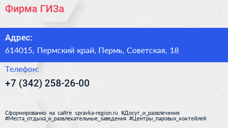 Фирма ГИЗа по адресу 614015, Пермский край, Пермь, Советская, 18 в дальнейшем Организация, размещена в следующих категориях: