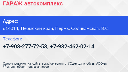 ГАРАЖ, автокомплекс по адресу 614014, Пермский край, Пермь, Соликамская, 87а в дальнейшем Организация, размещена в следующих категориях: