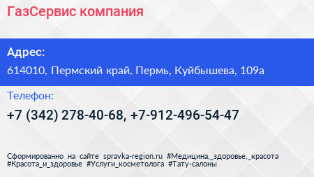 ГазСервис, компания по адресу 614010, Пермский край, Пермь, Куйбышева, 109а в дальнейшем Организация, размещена в следующих категориях: