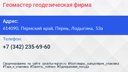 Геомастер, геодезическая фирма по адресу 614090, Пермский край, Пермь, Лодыгина, 53а в дальнейшем Организация, размещена в следующих категориях: