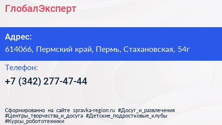 ГлобалЭксперт по адресу 614066, Пермский край, Пермь, Стахановская, 54г в дальнейшем Организация, размещена в следующих категориях: