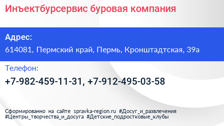 Инъектбурсервис, буровая компания по адресу 614081, Пермский край, Пермь, Кронштадтская, 39а в дальнейшем Организация, размещена в следующих категориях: