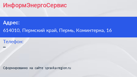 ИнформЭнергоСервис по адресу 614010, Пермский край, Пермь, Коминтерна, 16 в дальнейшем Организация, размещена в следующих категориях: