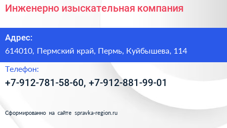 Инженерно-изыскательная компания по адресу 614010, Пермский край, Пермь, Куйбышева, 114 в дальнейшем Организация, размещена в следующих категориях:
