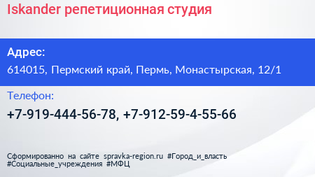 Iskander, репетиционная студия по адресу 614015, Пермский край, Пермь, Монастырская, 12/1 в дальнейшем Организация, размещена в следующих категориях: